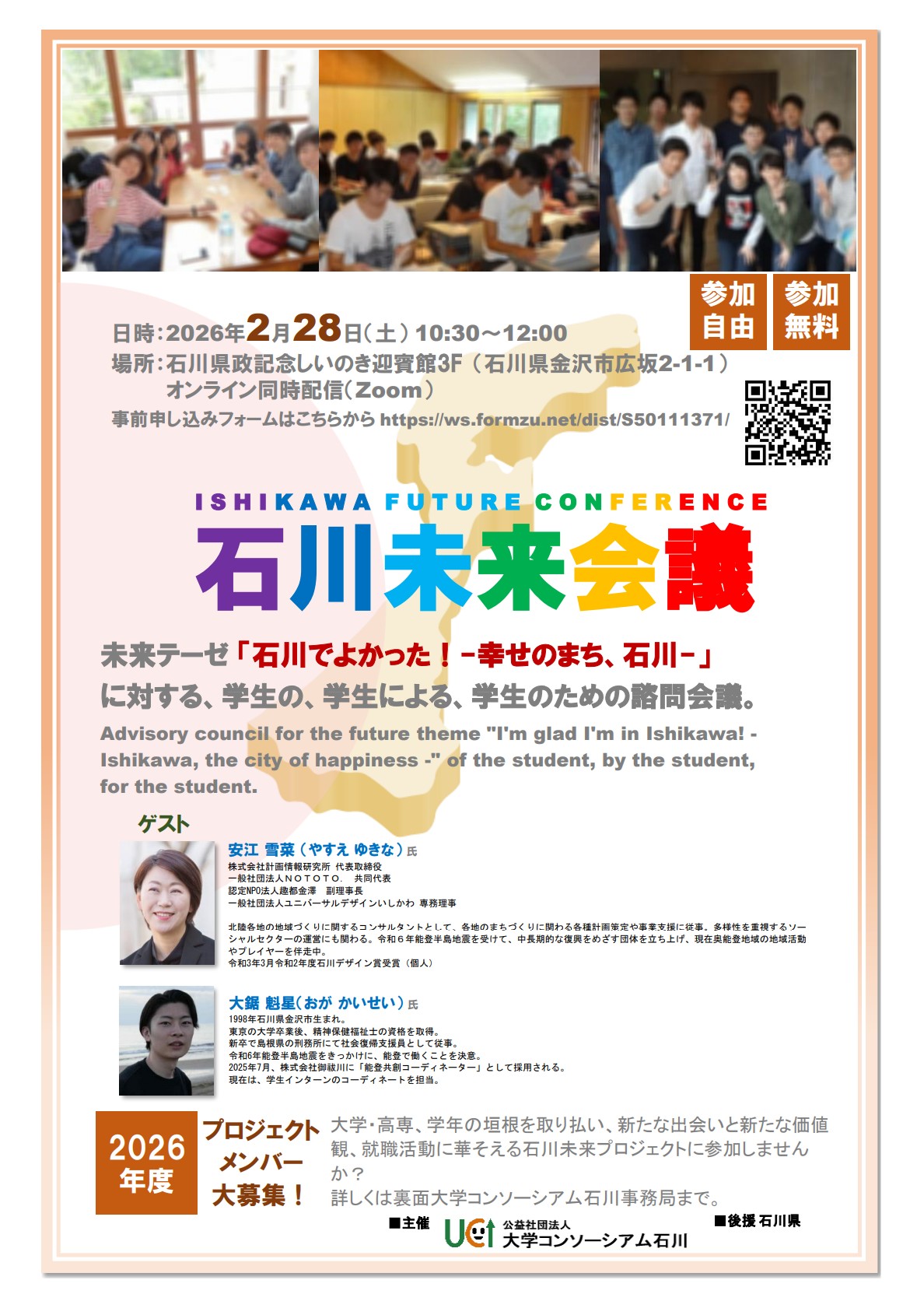 大学生・高専生 市民・企業 教職員 高校生・中学生 2025年度石川未来会議 開催のご案内 2026年2月28日(土) PDFダウンロード 2025年度石川未来会議 開催のご案内 日 時 2026年2月28日(土) 会 場 石川県政記念しいのき迎賓館3F(石川県金沢市広坂2-1-1) ※Zoom同時配信 申込み 下記URL あるいは QRコードから事前申込をお願いいたします (当日の参加URLお知らせいたします) https://ws.formzu.net/fgen/S50111371/