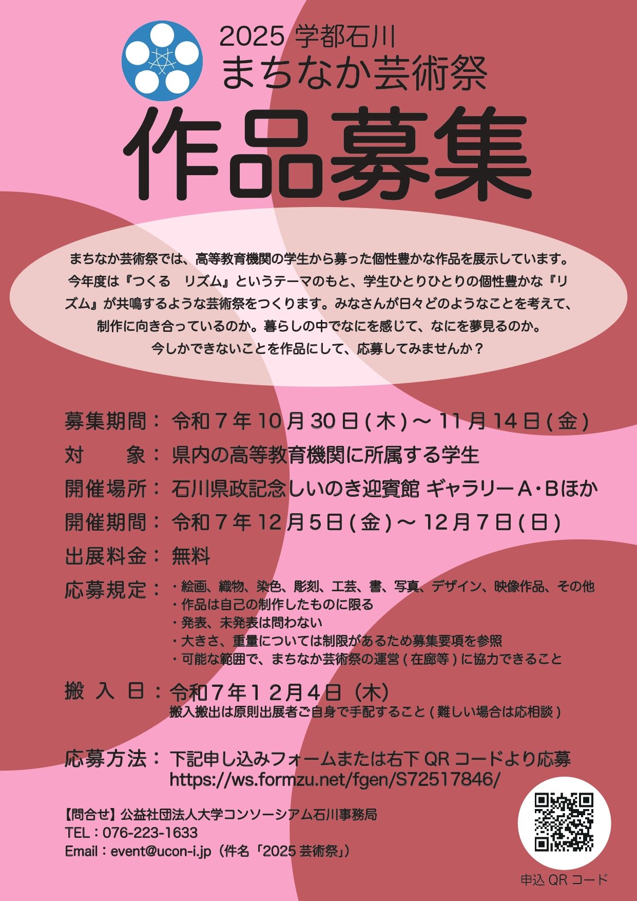今年も「学都石川」まちなか芸術祭開催!!出展作品を大募集中!!今年度は『つくる リズム』というテーマのもと、学生ひとりひとりの個性豊かな『リズム』が共鳴するような芸術祭をつくります。 みなさんが日々どのようなことを考えて、制作に向き合っているのか。 暮らしの中でなにを感じて、なにを夢見るのか。 今しかできないことを作品にして、応募してみませんか? 県内大学・大学院・短大・高専の皆さんはどなたでも大歓迎! ぜひオリジナリティあふれるあなたの作品をお待ちしております! 学園祭で披露した作品をしいのき迎賓館でもう一度!【募集作品】 ●絵画、織物、染色、彫刻、工芸、書、写真、デザイン、映像作品、その他美術作品 ※作品は自己の制作したものに限ります ※発表、未発表は問いません ※大きさ・重量についての詳細は募集要項でご確認ください